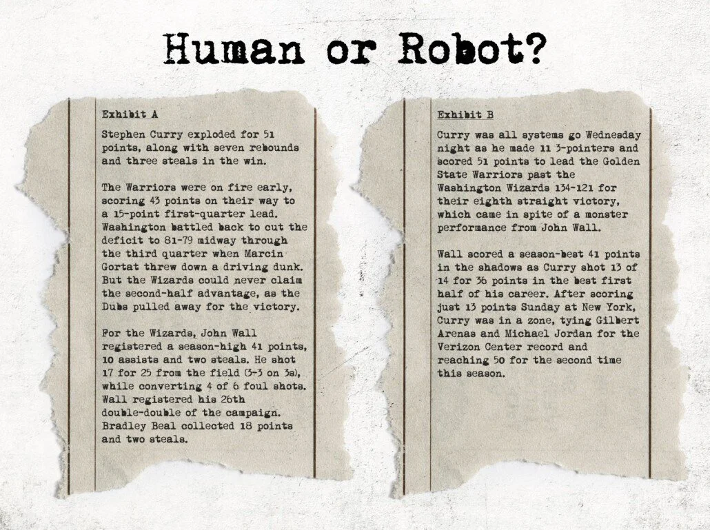 Scrittori, artisti e altri creativi tendono a scartare la minaccia dell'intelligenza artificiale sulla presupposta che un algoritmo non riuscirà mai ad essere veramente “creativo”, però cominciamo a vedere che questa idea non è esattamente valida. Per esempio, ci sono dei computer che scrivono poesie o che creano opere d'arte (video in inglese). Insomma, generatori automatici di contenuti già creano più testi a qualità maggiore in certi ambiti rispetto a noi umani collettivamente, però, per capire meglio le limitazioni della NLG, vediamo due articoli brevi su un evento sportivo, il basket in questo caso: